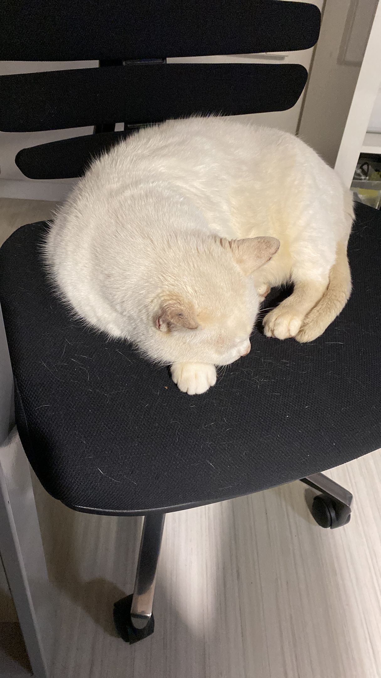 Dormì tutta la notte come un bambino sul divano dell'ufficio, e poi diventò un "sopramobile" . Il mio ufficio diventò la sua nuova casa, il suo rifugio tant'è che dormiva sul tavolo alle mie spalle, e poi passava il giorno al mio fianco su una poltroncina oramai diventata sua!.
