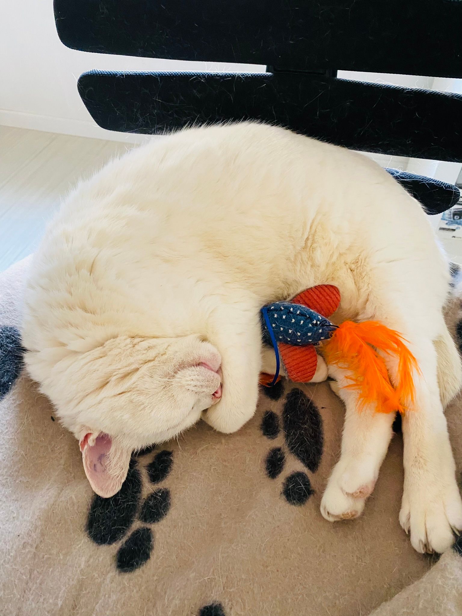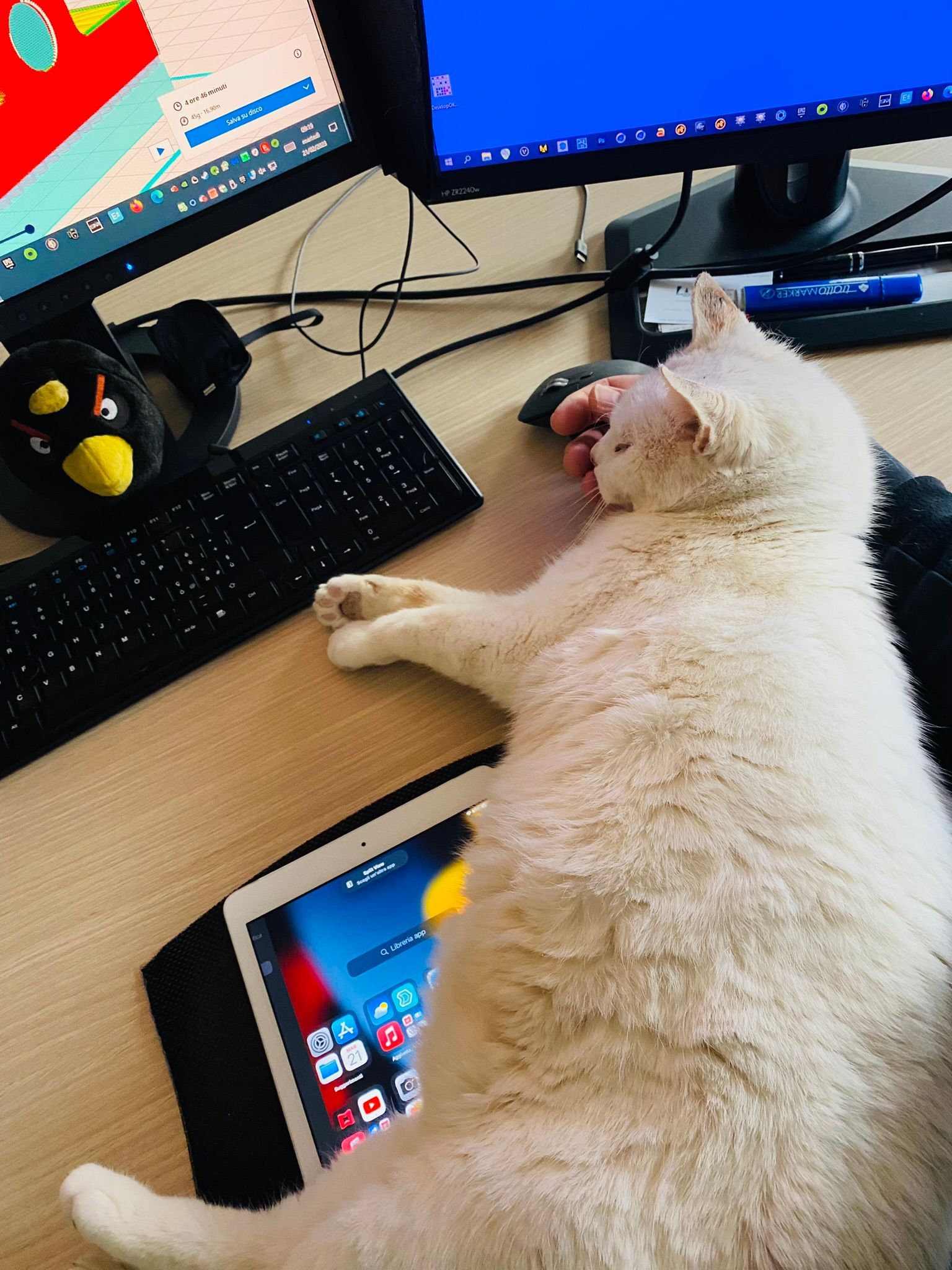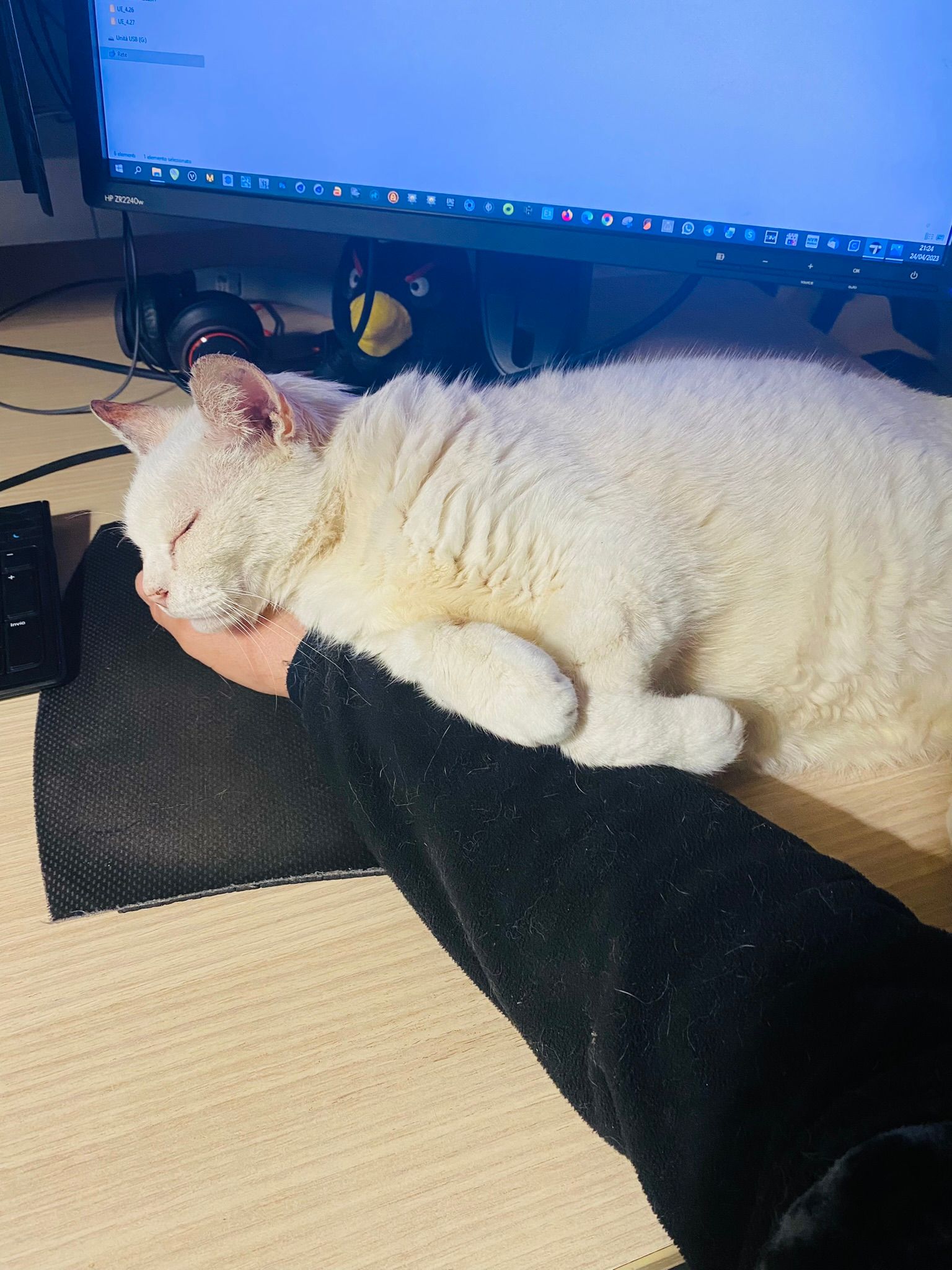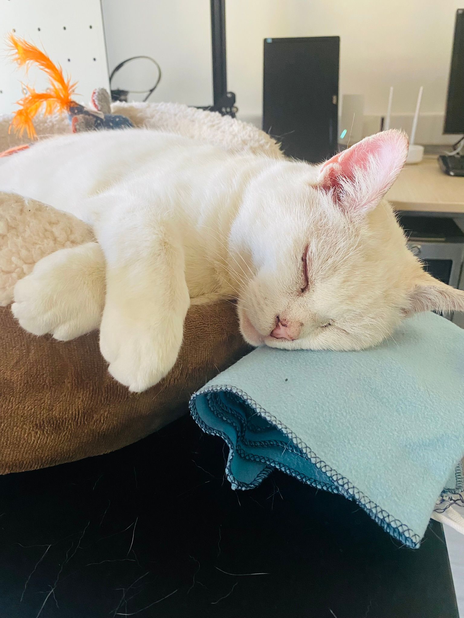 Dormì tutta la notte come un bambino sul divano dell'ufficio, e poi diventò un "sopramobile" . Il mio ufficio diventò la sua nuova casa, il suo rifugio tant'è che dormiva sul tavolo alle mie spalle, e poi passava il giorno al mio fianco su una poltroncina oramai diventata sua!.
